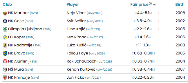 Pri Aluminiju je na prvem mestu Rok Schaubauch (630.000-740.000), pri Muri obetavni najstniški napadalec Kenan Kurtović (380.000-440.000), pri Primorju pa Jon Ficko z ocenjeno prestopno vrednostjo med 220.000 in 260.000 evri.