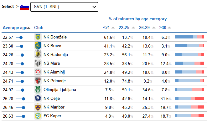 V Sloveniji ima najstarejšo ekipo v povprečju Koper (26,63), sledijo Maribor, Celje in Olimpija. Poleg Domžal z najmlajšim kadrom v Prvi ligi Telemach nastopata še Bravo in Radomlje.